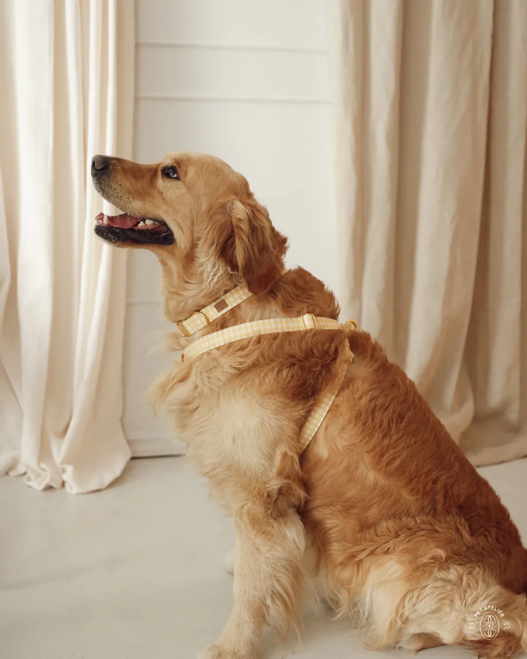 Arnés ajustable con estampado Vichy en tono amarillo luminoso, diseñado para ofrecer comodidad y estilo en cada paseo.